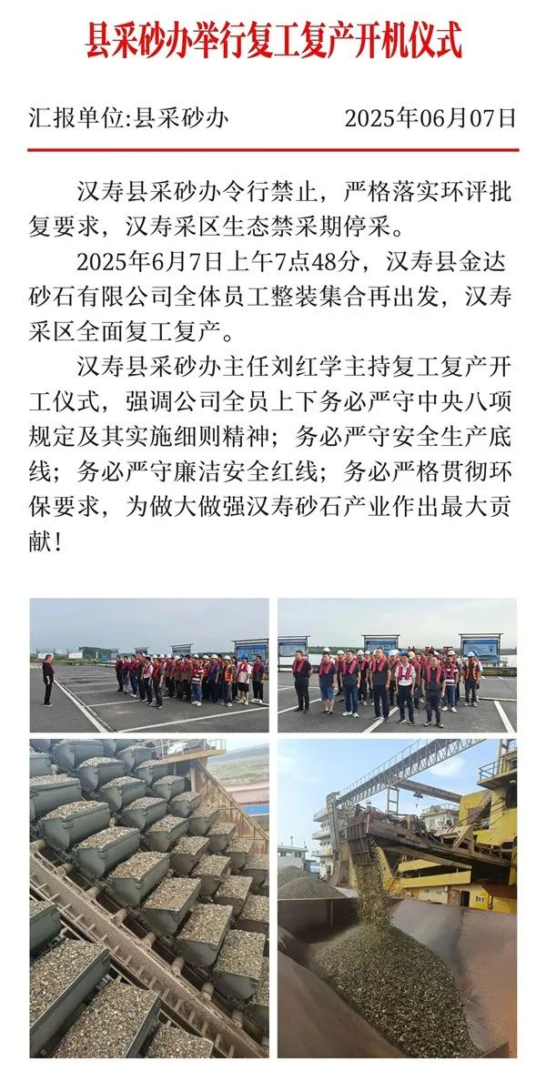 2025年6月7日上午,湖南省常德市漢壽縣采砂辦舉行復(fù)工復(fù)產(chǎn)開機(jī)儀式,標(biāo)志著洞庭湖砂漢壽采區(qū)全面復(fù)工復(fù)產(chǎn)。 據(jù)悉,漢壽縣有金石垸和太湖垸兩個(gè)可采區(qū),可采面積5.24平方千米,規(guī)劃期控制開采總量1.2億噸。主要產(chǎn)品為小卵石、大鵝卵石、混合卵石和青砂,品質(zhì)優(yōu)良,暢銷長沙、湖北、江西、安徽、江蘇、上海、浙江等地。 2024年12月13日,通過招商比選,漢壽縣現(xiàn)代農(nóng)業(yè)投資開發(fā)有限公司(漢壽縣金達(dá)砂石有限公司母公司)以8億元中標(biāo)了這2處河砂開采權(quán),采砂控制量為4000萬噸,成交單價(jià)為20元/噸。 漢壽縣采砂辦主任劉紅學(xué)主持復(fù)工復(fù)產(chǎn)開工儀式,強(qiáng)調(diào)公司全員上下務(wù)必嚴(yán)守中央八項(xiàng)規(guī)定及其實(shí)施細(xì)則精神;務(wù)必嚴(yán)守安全生產(chǎn)底線,務(wù)必嚴(yán)守廉潔安全紅線;務(wù)必嚴(yán)格貫徹環(huán)保要求,為做大做強(qiáng)漢壽砂石產(chǎn)業(yè)作出最大貢獻(xiàn)。 此外,湖南省益陽市的資陽區(qū)明朗采區(qū)和沅江市巴南湖采區(qū)也結(jié)束了生態(tài)禁采期,于2025年5月1日開始復(fù)采。