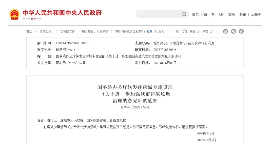 據(jù)中國政府網(wǎng)消息,日前,國務(wù)院辦公廳轉(zhuǎn)發(fā)住房城鄉(xiāng)建設(shè)部《關(guān)于進(jìn)一步加強(qiáng)城市建筑垃圾治理的意見》。《意見》提出,到2027年,健全城市建筑垃圾治理體系,完善建筑垃圾管理法規(guī)政策和標(biāo)準(zhǔn)規(guī)范,建筑垃圾全過程管理制度得到有效落實(shí),偷排亂倒問題得到有效遏制,全國地級及以上城市建筑垃圾平均資源化利用率達(dá)到50%以上,城市建筑垃圾有效治理新格局基本形成。詳情如下: 國務(wù)院辦公廳轉(zhuǎn)發(fā)住房城鄉(xiāng)建設(shè)部《關(guān)于進(jìn)一步加強(qiáng)城市建筑垃圾治理的意見》的通知 國辦函〔2025〕57號 各省、自治區(qū)、直轄市人民政府,國務(wù)院各部委、各直屬機(jī)構(gòu): 住房城鄉(xiāng)建設(shè)部《關(guān)于進(jìn)一步加強(qiáng)城市建筑垃圾治理的意見》已經(jīng)國務(wù)院同意,現(xiàn)轉(zhuǎn)發(fā)給你們,請認(rèn)真貫徹落實(shí)。 國務(wù)院辦公廳 2025年6月6日 (此件公開發(fā)布) 關(guān)于進(jìn)一步加強(qiáng)城市建筑垃圾治理的意見 住房城鄉(xiāng)建設(shè)部 為貫徹落實(shí)《中華人民共和國固體廢物污染環(huán)境防治法》等法律法規(guī)規(guī)定,進(jìn)一步加強(qiáng)城市建筑垃圾治理,提升資源化利用水平,推動行業(yè)高質(zhì)量發(fā)展,現(xiàn)提出如下意見。 一、總體要求 堅持以習(xí)近平新時代中國特色社會主義思想為指導(dǎo),深入貫徹黨的二十大和二十屆二中、三中全會精神,全面貫徹習(xí)近平生態(tài)文明思想,完整準(zhǔn)確全面貫徹新發(fā)展理念,統(tǒng)籌城市規(guī)劃、建設(shè)、管理,堅持問題導(dǎo)向與系統(tǒng)治理相結(jié)合、存量治理與增量控制相結(jié)合、有效處置與資源化利用相結(jié)合、政府主導(dǎo)與社會參與相結(jié)合,健全城市建筑垃圾治理體系,提升治理效能,促進(jìn)建筑垃圾減量化、資源化、無害化,為全面推進(jìn)美麗中國建設(shè)提供有力支撐。 到2027年,健全城市建筑垃圾治理體系,完善建筑垃圾管理法規(guī)政策和標(biāo)準(zhǔn)規(guī)范,建筑垃圾全過程管理制度得到有效落實(shí),偷排亂倒問題得到有效遏制,全國地級及以上城市建筑垃圾平均資源化利用率達(dá)到50%以上,城市建筑垃圾有效治理新格局基本形成。 二、加強(qiáng)建筑垃圾源頭管理 (一)壓實(shí)減量責(zé)任。落實(shí)工程建設(shè)單位、設(shè)計單位、施工單位等主體責(zé)任,采用新型建造方式,大力發(fā)展裝配式建筑,創(chuàng)新設(shè)計、施工技術(shù)與裝備。推廣綠色施工和全裝修交付,從源頭減少建筑垃圾產(chǎn)生。工程建設(shè)單位應(yīng)將建筑垃圾減量、運(yùn)輸、利用、處置所需費(fèi)用列入工程造價。(住房城鄉(xiāng)建設(shè)部、交通運(yùn)輸部、水利部、國家鐵路局按職責(zé)分工負(fù)責(zé),地方人民政府負(fù)責(zé)落實(shí)。以下均需地方人民政府落實(shí),不再列出) (二)實(shí)行分類處理。各地要依照《建筑垃圾處理技術(shù)標(biāo)準(zhǔn)》,將建筑垃圾分為工程渣土、工程泥漿、工程垃圾、拆除垃圾、裝修垃圾,實(shí)行分類處理,因地制宜明確處理方式。嚴(yán)禁將建筑垃圾直接與生活垃圾混合處理。原則上,工程渣土和干化處理后的工程泥漿可用于土方平衡、場地平整、道路建設(shè)、環(huán)境治理或燒結(jié)制品等;工程垃圾、拆除垃圾、裝修垃圾應(yīng)優(yōu)先用于生產(chǎn)再生骨料、再生建材、道路材料等;無法利用的,應(yīng)進(jìn)行無害化處置,保障處置安全,防止污染環(huán)境。(住房城鄉(xiāng)建設(shè)部牽頭,生態(tài)環(huán)境部、交通運(yùn)輸部、水利部、國家鐵路局按職責(zé)分工負(fù)責(zé)) (三)強(qiáng)化施工現(xiàn)場管理。工程建設(shè)主管部門應(yīng)督促工程建設(shè)單位和施工單位,劃定建筑垃圾分類貯存場所,分類收集建筑垃圾,選擇符合條件的運(yùn)輸單位及時清運(yùn),規(guī)范運(yùn)輸車輛進(jìn)出管理,并按規(guī)定對建筑垃圾進(jìn)行利用、處置。各地要因地制宜推進(jìn)建筑拆除與建筑垃圾資源化利用一體化。(住房城鄉(xiāng)建設(shè)部、交通運(yùn)輸部、水利部、國家鐵路局按職責(zé)分工負(fù)責(zé)) (四)規(guī)范裝修垃圾管理。各地要明確裝修垃圾投放、收運(yùn)管理要求,落實(shí)屬地政府、物業(yè)服務(wù)單位責(zé)任,引導(dǎo)合理設(shè)置裝修垃圾投放點(diǎn),采取必要的污染防治措施,保持周邊環(huán)境整潔。鼓勵采取提前預(yù)約、袋裝投放、箱體收集等方式收運(yùn)裝修垃圾。(住房城鄉(xiāng)建設(shè)部負(fù)責(zé)) 三、強(qiáng)化建筑垃圾運(yùn)輸監(jiān)管 (五)明確技術(shù)要求。各地要制定完善建筑垃圾運(yùn)輸車輛、船舶相關(guān)技術(shù)要求,明確外觀規(guī)格、標(biāo)志標(biāo)識、密閉裝置、北斗衛(wèi)星定位、安全配置、裝卸記錄、數(shù)據(jù)傳輸?shù)纫螅膭钍褂眯履茉窜囕v、船舶運(yùn)輸建筑垃圾。(住房城鄉(xiāng)建設(shè)部牽頭,工業(yè)和信息化部、公安部、交通運(yùn)輸部、市場監(jiān)管總局按職責(zé)分工負(fù)責(zé)) (六)規(guī)范運(yùn)輸管理。各地要結(jié)合實(shí)際,科學(xué)評估本行政區(qū)域內(nèi)建筑垃圾產(chǎn)生量、