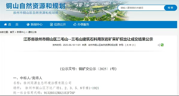 近日,江蘇省徐州市自然資源網(wǎng)上交易系統(tǒng)發(fā)布銅山區(qū)二毛山-三毛山建筑石料用灰?guī)r礦掛牌出讓結(jié)果。當(dāng)?shù)貒笮熘萃瓷鷳B(tài)環(huán)境治理有限公司底價(jià)5.6億元競得。該礦資源儲(chǔ)備量9297.79萬噸,出讓年限16年。根據(jù)公告,該礦未公布具體生產(chǎn)規(guī)模,經(jīng)測算,年產(chǎn)能約600萬噸,競得單價(jià)6.02元/噸。