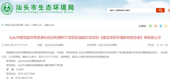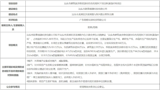 近日,汕頭市生態(tài)環(huán)境局發(fā)布,汕頭市建筑廢棄物資源化綜合利用BOT項目新溪臨時場項目《建設項目環(huán)境影響報告表》審批前公示。 預計投產后總處置能力為181.5萬t/a,包括建筑余泥66萬t/a、建筑渣土99萬t/a、拆除廢棄物及裝修垃圾16.5萬t/a,處置后的資源通過綜合利用,并外購18.15萬t/a的海砂和2.475萬t/a的水泥,添加42903t/a的水進行配套生產。預計建成后可生產66萬t/a的成品砂、39.6萬t/a水穩(wěn)料、32.835萬t/a的回填骨料、676492t/a的泥餅及分揀廢金屬、分揀雜物等。 根據(jù)建設項目環(huán)境影響評價審批程序的有關規(guī)定,經審議,我局擬批準《汕頭市建筑廢棄物資源化綜合利用BOT項目新溪臨時場項目環(huán)境影響報告表》,為體現(xiàn)公開、公正的原則,強化公眾參與,現(xiàn)予公示5個工作日,如有意見,請在公示期內來信或來電向我局反映。 聯(lián)系單位:汕頭市生態(tài)環(huán)境局龍湖分局 聯(lián)系地址:汕頭市龍湖區(qū)珠池路振海大廈后側物產樓5樓 郵 編:515041 聯(lián)系電話:0754-82773509 傳 真:0754-88267729 聽證告知:依據(jù)《中華人民共和國行政許可法》,自公示之日起五個工作日內該審批直接涉及其重大利益關系的申請人、利害關系人可對以下擬作出的建設項目環(huán)境影響評價文件批復決定以書面形式提出聽證申請。
