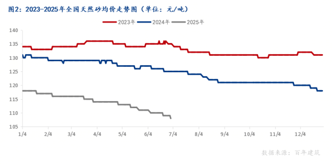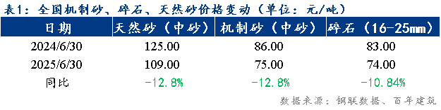 據(jù)百年建筑網(wǎng)數(shù)據(jù)顯示,截至2025年6月30日,天然砂均價109元/噸,同比比下跌12.8%;機(jī)制砂均價75元/噸,同比下跌12.8%;碎石均價74元/噸,月同比下跌10.84%。多地雨水影響較大,建筑施工進(jìn)度下降,采購砂石供應(yīng)攪拌站、直供項目量下降,貿(mào)易競爭加劇,沿江、沿海砂石礦山產(chǎn)能過剩,價格持續(xù)走低。