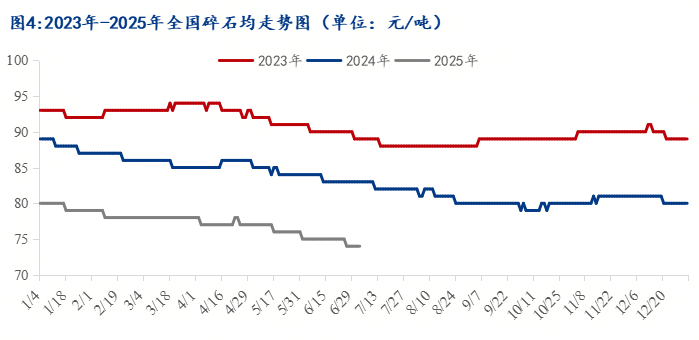 據(jù)百年建筑網(wǎng)統(tǒng)計,截至7月4日,全國碎石價格為76元/噸,同比下降12.16%。25年一月碎石價格為半年度最高位,后續(xù)半年一路下行。一季度春節(jié)后復(fù)工復(fù)產(chǎn),碎石需求較穩(wěn),但需求端恢復(fù)情況偏差,導(dǎo)致庫存積壓,后續(xù)為降低庫存,廠家進(jìn)行降價促銷。二季度依舊維持供需雙弱局面,其中重點工程進(jìn)度略好,高標(biāo)碎石有支撐點,普料競爭激烈,加上攪拌站縮量,價格下滑幅度偏大。