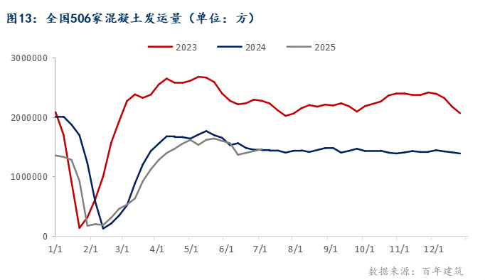 建筑砂石普料80%流入建筑工地房地產(chǎn)項目為主,據(jù)百年建筑網(wǎng)調(diào)研,截至6月底,上半年國內(nèi)506家混凝土企業(yè)產(chǎn)量為2590萬方,同比減少20.4%。跟據(jù)百年建筑網(wǎng)調(diào)研的506家混凝土2025年上半年產(chǎn)量數(shù)據(jù)來看,同比增長的省份僅有海南和新疆。同比降幅超過30%的省份有四川、重慶、陜西、湖南、江西。海南上半年增長的主要原因在于自貿(mào)港建設(shè),需求了具有一定支撐;新疆市場混凝土混凝土塔筒項目涌現(xiàn)出需求支撐。其他重點城市混凝土產(chǎn)量基本均保持下降趨勢。尤其在6月,各地混凝土產(chǎn)量降幅尤為明顯。南方及北方市場降雨較多,華東地區(qū)梅雨季提前,導(dǎo)致連續(xù)降雨,此外大型考試,施工項目進(jìn)度放緩。預(yù)計下半年國內(nèi)混凝土發(fā)運量或?qū)⒙杂谢厣?,但依然難趕上去年同期水平。砂石骨料在商品混凝土原料占73%左右,因此砂石普料下半年用量或?qū)⒊掷m(xù)減少。