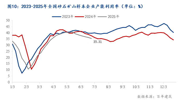 據(jù)百年建筑數(shù)據(jù)統(tǒng)計,2025年1-6月全國砂石產(chǎn)量約67.2億噸,同比下降10.4%。截至2025年6月30日,全國砂石綜合均價86元/噸,同比下降12.24%。分品種來看,天然砂均價109元/噸,同比下降12.8%;機(jī)制砂均價75元/噸,同比下降12.7%;碎石均價74元/噸,同比下跌12.97%。據(jù)百年建筑網(wǎng)調(diào)研1-6月份砂石礦山累計發(fā)貨量約35780.97萬噸,累計同比下降10.4%;據(jù)測算砂石礦山產(chǎn)能利用率為35.31%,較上月下降2.82個百分點,月環(huán)比下降7.39%,同比下降5.81%。三季度平緩過度,四季度建筑市場趕工現(xiàn)象較多,預(yù)計下半年砂石價格行情或?qū)⑿》磸棧V山貨量及產(chǎn)能利用率或?qū)⒂兴厣?/span>