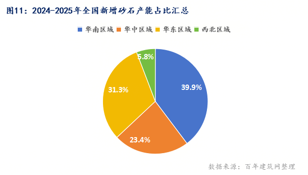 據(jù)百年建筑網(wǎng)不完全統(tǒng)計,2024-2025年上半年新投產(chǎn)砂石骨料產(chǎn)能約5.12億噸,分產(chǎn)能受各種因素影響未能在上半年完全釋放,釋放產(chǎn)能僅20-30%。預(yù)計下半年預(yù)計新增的產(chǎn)能可能釋放量達(dá)50%左右;從產(chǎn)能占比數(shù)據(jù)分析,華南地區(qū)占39.9%排第一,主要集中廣東、海南市場,廣西較少;華東地區(qū)占31.3%排第二,主要集中安徽、浙江,江西、福建市場沿江、沿海地區(qū)為主,山東較少;華中地區(qū)占23.4%排第三,主要集中湖北、湖南市場,河南較少。最少占比西北地區(qū)5.8%,陜西、山西。華北、東北占比暫無統(tǒng)計。