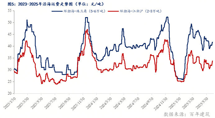 2025年上半年全國沿海運費,先揚后抑,春節(jié)后市場冬儲預(yù)定大宗商品,開始進(jìn)行發(fā)貨貨,帶動運費上漲,基本每年春節(jié)前后沿海運費保持最低水平運行,屆時北方低價砂石料料借助水運優(yōu)勢發(fā)往長三角地區(qū)。2025年一季度沿海運費持續(xù)回升,二季度震蕩下行。進(jìn)入6月份,沿海運費震蕩運行,短期煤炭、糧油等大宗交易量回升,出口量增加,北方港口砂石平倉交易價和量持穩(wěn),目前環(huán)渤海發(fā)往珠三角5-6萬噸船運費6月均價為40.84元/噸,較上月跌0.76元/噸,同比上漲5.1%。環(huán)渤海發(fā)往江浙滬2-3萬噸船運費均價為32.11元/噸,較上月漲0.21元/噸,同比上漲10.9%。福建1-1.5萬噸船發(fā)上海運費均價12-13元/噸;較上月持平,同比下跌14%。預(yù)計下半年沿海運費或?qū)⒈3终鹗幧闲汹厔葸\行。