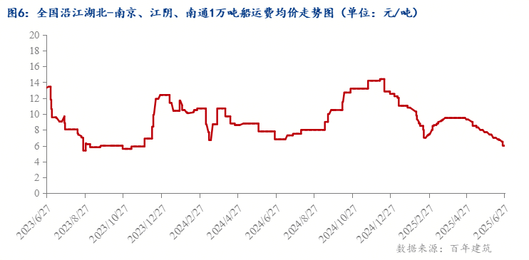 沿江運費方面,2025上半年分季度來看,第一季度春節(jié)假期,全國絕大多數(shù)項目工程處于停工狀態(tài),江運費高位回落;第二季度江運費高開低走,主要是受到暴雨以及極端天氣影響,施工淡季,江運費低位震蕩運行。1-6月均價8.7元/噸,同比下降5.9%。近期沿江船運費小幅回落,湖北發(fā)江蘇市場1萬噸船運費月均價下降1.5-2元/噸。目前湖南發(fā)-南京、江陰、南通、上海1-1.5萬噸船報6.5-11.5元/噸;湖北發(fā)南通、江陰、上海、蕪湖1-1.5萬噸船運費報5-9元/噸;重慶發(fā)江陰、南通、上海0.8-0.9萬噸運費21-25元/噸。本月度沿江一帶持續(xù)下雨,河道水位不斷回升,運載能力回升,運費走低。但后期受油價上漲,預(yù)計下半年8-9月需求回暖,沿江運價持穩(wěn)或小幅回升。