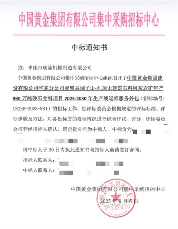 據(jù)了解,棗莊市瑞隆機(jī)械制造有限公司(以下簡(jiǎn)稱“瑞隆重工”)成功中標(biāo)中國(guó)黃金集團(tuán)建設(shè)有限公司華東分公司靈璧縣堌子山-九頂山建筑石料用灰?guī)r礦年產(chǎn)990萬(wàn)噸砂石骨料項(xiàng)目2025-2030年生產(chǎn)線運(yùn)維服務(wù)。
