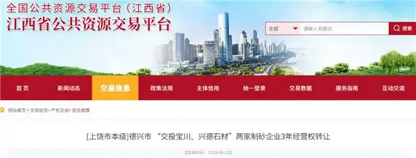 位于江西上饒的德興市交投寶川環(huán)保建筑材料有限公司、德興市興德石材制砂有限公司兩家機制砂企業(yè)的經(jīng)營權(quán)將于2025年9月30日公開拍賣。據(jù)悉,本次拍賣為上述兩家企業(yè)經(jīng)營權(quán)整體捆綁拍賣,經(jīng)營期3年,掛牌價共5870.4萬元,起拍價1956.8萬元/年(其中交投寶川1102.8萬元/年、興德石材854萬元/年)。