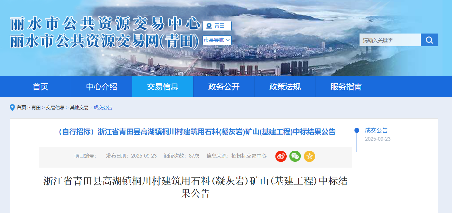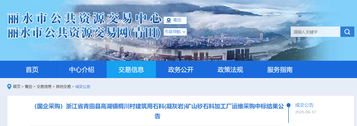 近日,浙江麗水市公共資源交易中心發(fā)布浙江省青田縣高湖鎮(zhèn)桐川村建筑用石料(凝灰?guī)r)礦山砂石料加工廠運維采購和礦山(基建工程)中標(biāo)結(jié)果。其中,南平市鵬興工程機(jī)械有限公司以6955萬元中標(biāo)該礦山(基建工程) 施工招標(biāo),寧波銘滇建筑工程有限公司以投入生產(chǎn)前設(shè)備維修更新60萬元、建筑用石料加工6400萬元中標(biāo)該項目。