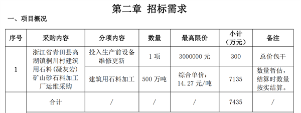 寧波銘滇建筑工程有限公司(民企)以投入生產(chǎn)前設(shè)備維修更新60萬元、建筑用石料加工6400萬元中標(biāo)該項目。按照招標(biāo)公告暫估數(shù)量500萬噸來計算,該項目加工中標(biāo)單價12.8元/噸。