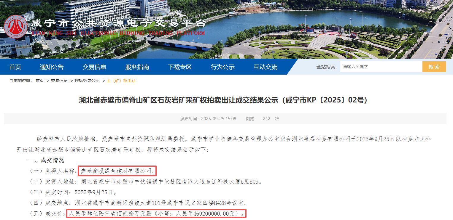 近日,湖北省赤壁市偏脊山區(qū)石灰?guī)r礦采礦權(quán)成功出讓。當(dāng)?shù)貒?guó)企赤壁高投綠色建材有限公司以46920萬(wàn)元元成功競(jìng)得該礦權(quán)。