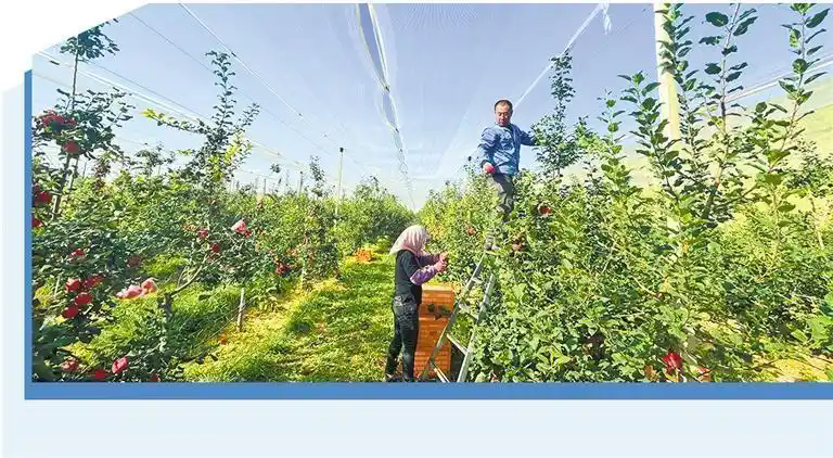 工作人員正在采摘大飯鋪煤礦復(fù)墾區(qū)上種植的蘋果。