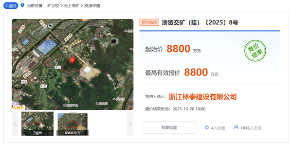 10月20日,浙江自然資源廳發布寧波市北侖區小港街道依山村徐山建筑用石料(凝灰巖)礦采礦權競得入選企業。根據出讓公告,該礦出讓資源總量1166.3萬噸,設計規模680萬噸/年,起始價8800萬元,凈礦出讓成本約7997萬元,出讓期限2年(含基建期6個月),相當于1年半開采完畢,浙江林泰建設有限公司底價競得該項目采礦權,資源價款14.4元/噸。