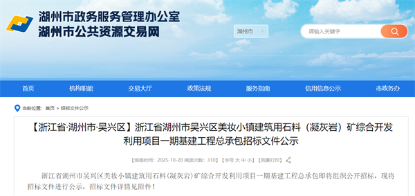 浙江省湖州市吳興區(qū)美妝小鎮(zhèn)建筑用石料(凝灰?guī)r)礦綜合開(kāi)發(fā)利用項(xiàng)目位于東林鎮(zhèn)南山村-埭溪鎮(zhèn)小羊山村境內(nèi),礦區(qū)范圍內(nèi)共計(jì)出讓資源量約2.89億噸,生產(chǎn)規(guī)模990萬(wàn)噸/年。招標(biāo)文件指出,該項(xiàng)目根據(jù)礦山地形地貌特點(diǎn)和防排水條件,確定分兩期進(jìn)行開(kāi)采。本次招標(biāo)為一期基建工程施工,開(kāi)采范圍共有19個(gè)拐點(diǎn)圈定,包括但不限于運(yùn)輸?shù)缆芳白鳂I(yè)平臺(tái)、道路附屬設(shè)施、場(chǎng)地石方工程、礦區(qū)生產(chǎn)附屬設(shè)施等開(kāi)采基礎(chǔ)及配套設(shè)施施工。