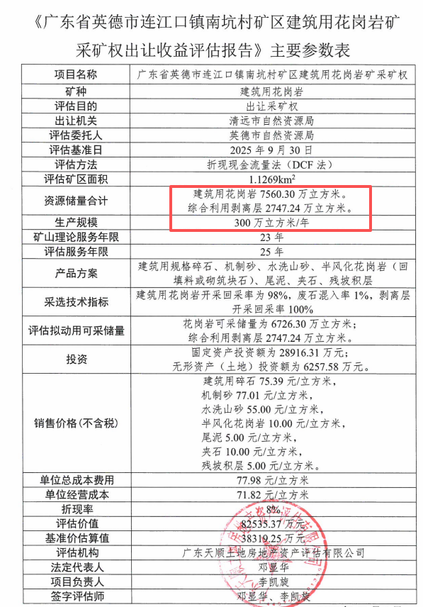 據(jù)悉,截至評(píng)估基準(zhǔn)日2025年9月30日,廣東省英德市連江口鎮(zhèn)南坑村礦區(qū)建筑用花崗巖礦保有建筑用花崗巖礦7560.30萬(wàn)立方米,其中,控制資源量6411.07萬(wàn)立方米、推斷資源量1149.23萬(wàn)立方米。綜合利用剝離層2747.24萬(wàn)立方米,其中:殘坡積層387.22萬(wàn)立方米、全風(fēng)化花崗巖1265.07萬(wàn)立方米、半風(fēng)化花崗巖1026.77萬(wàn)立方米、夾石68.18萬(wàn)立方米。