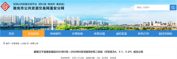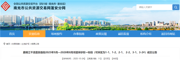 10月24日,四川省南充市嘉陵江干流蓬安縣段2025年9月-2028年8月河道采砂權(quán)一、二標(biāo)段成功出讓。據(jù)悉,兩標(biāo)段出讓砂石總方量為950萬方(1900萬噸),成交價超7.07億元,折合37.26元/噸。競得人均為蓬安縣吉興礦業(yè)開發(fā)有限責(zé)任公司,開采時間為3年。