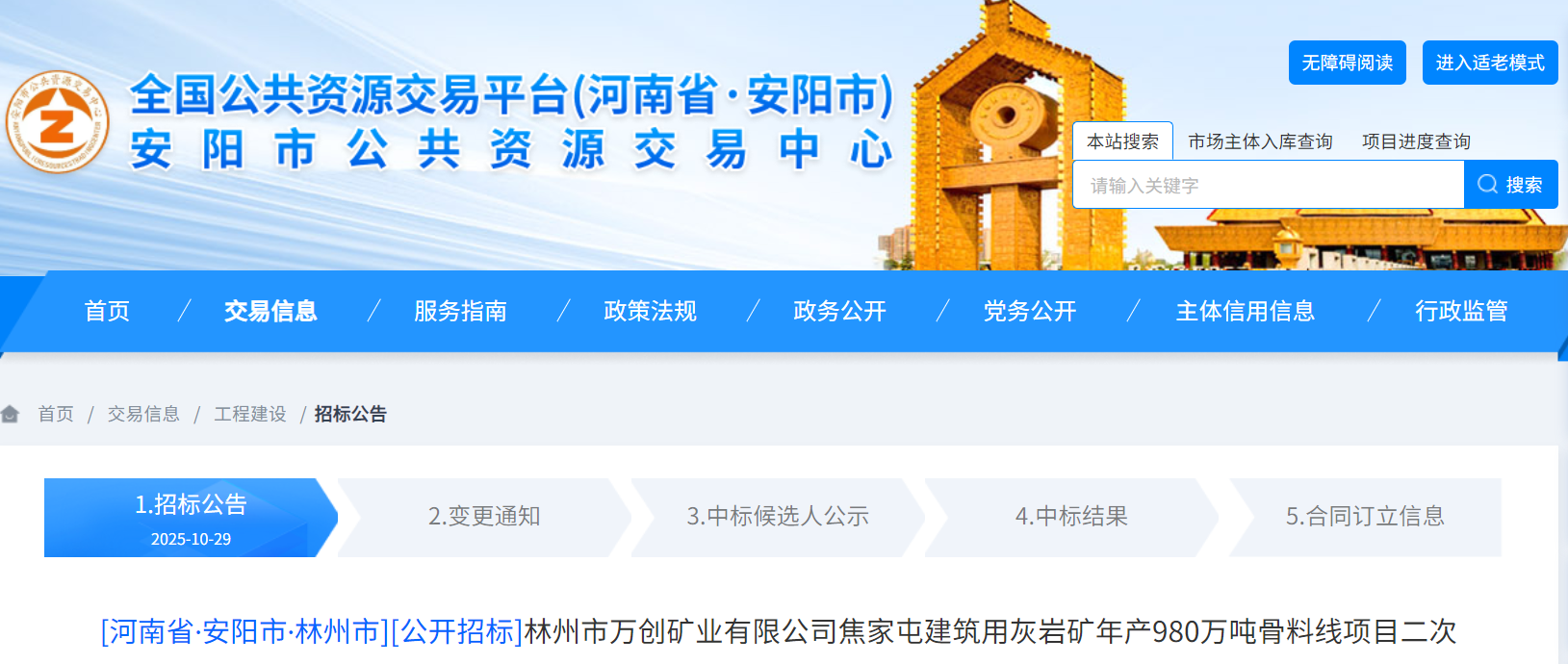 林州市萬創(chuàng)礦業(yè)有限公司焦家屯建筑用灰?guī)r礦年產(chǎn)980萬噸骨料線項目二次招標公告