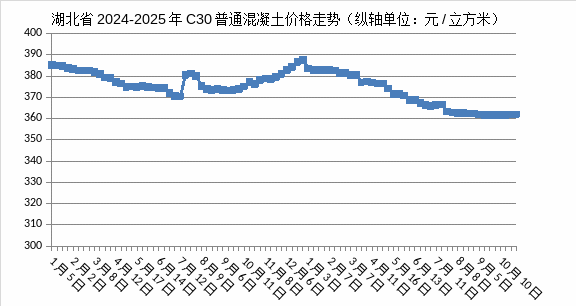 作為建材產(chǎn)業(yè)鏈的下游產(chǎn)品,普通混凝土價(jià)格受上游原材料價(jià)格及自身市場(chǎng)需求影響顯著。10月份,湖北省強(qiáng)度等級(jí)C30普通混凝土全省均價(jià)為361.83元/立方米,環(huán)比上漲0.02%,同比下降3.81%。
