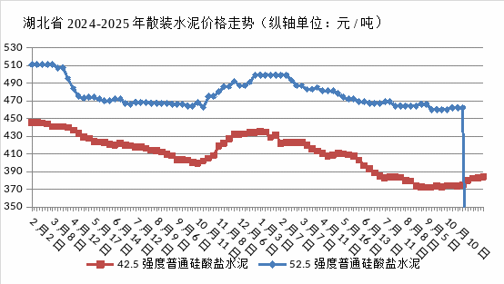 10月份,湖北省水泥市場(chǎng)價(jià)格呈現(xiàn)明顯的品種分化態(tài)勢(shì),不同強(qiáng)度等級(jí)、不同類型的水泥價(jià)格變動(dòng)方向各異。具體來看,42.5強(qiáng)度普通硅酸鹽水泥全省平均價(jià)格為382.20元/噸,環(huán)比上漲2.17%,同比下降10.50%;42.5強(qiáng)度礦渣硅酸鹽水泥全省平均價(jià)格為374.52元/噸,環(huán)比下降0.33%,同比下降6.72%;52.5強(qiáng)度普通硅酸鹽水泥全省平均價(jià)格為461.50元/噸,環(huán)比持平,同比下降2.84%。