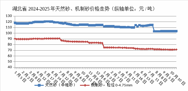 10月份,湖北省砂石市場(chǎng)價(jià)格整體呈下跌態(tài)勢(shì),天然砂與機(jī)制砂價(jià)格走勢(shì)趨于一致。監(jiān)測(cè)數(shù)據(jù)顯示,天然砂(中粗砂)全省均價(jià)為103.66元/噸,環(huán)比下降0.10%,同比下降9.74%;機(jī)制砂全省均價(jià)為71.23元/噸,環(huán)比下降0.08%,同比降幅達(dá)16.05%。