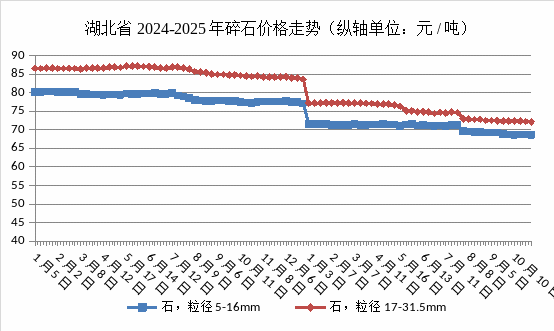 10月份,湖北省碎石市場(chǎng)價(jià)格延續(xù)下跌態(tài)勢(shì),不同粒徑規(guī)格的碎石價(jià)格均出現(xiàn)不同程度下降。其中,碎石(粒徑5-16mm)全省均價(jià)為68.68元/噸,環(huán)比下降0.52%,同比下降11.02%;碎石(粒徑17-31.5mm)全省均價(jià)為72.28元/噸,環(huán)比下降0.15%,同比下降14.28%。