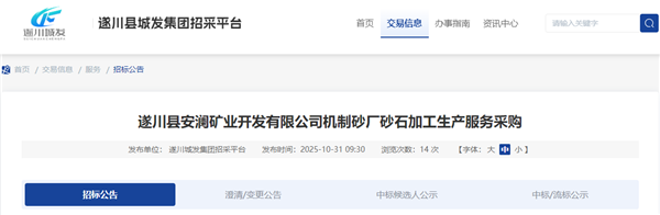 近日,遂川縣城發(fā)集團招采平臺發(fā)布遂川縣安瀾礦業(yè)開發(fā)有限公司機制砂廠砂石加工生產(chǎn)服務采購招標公告。項目投標截止時間為2025年11月21日,不接受聯(lián)合體投標。