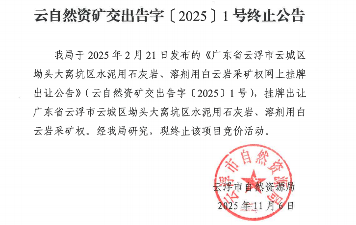 11月6日,廣東省云浮市自然資源局發布云城區坳頭大窩坑區水泥用石灰巖、溶劑用白云巖采礦權終止出讓公告。
