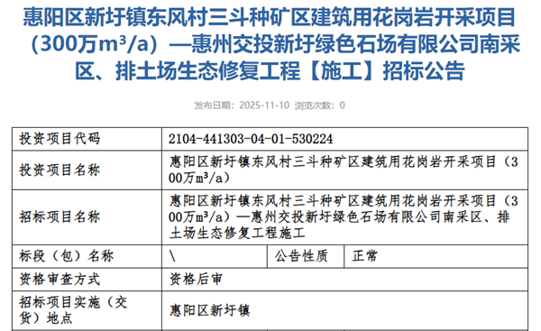 11月10日,廣東省惠州市公共資源交易中心發(fā)布惠州交投新圩綠色石場有限公司南采區(qū)、排土場生態(tài)修復(fù)工程(施工)招標(biāo)公告,投標(biāo)截止時間為2025年11月28日。該項目設(shè)計生產(chǎn)規(guī)模為300萬方/年,總服務(wù)年限為10年,最高投標(biāo)限價近1138萬元。