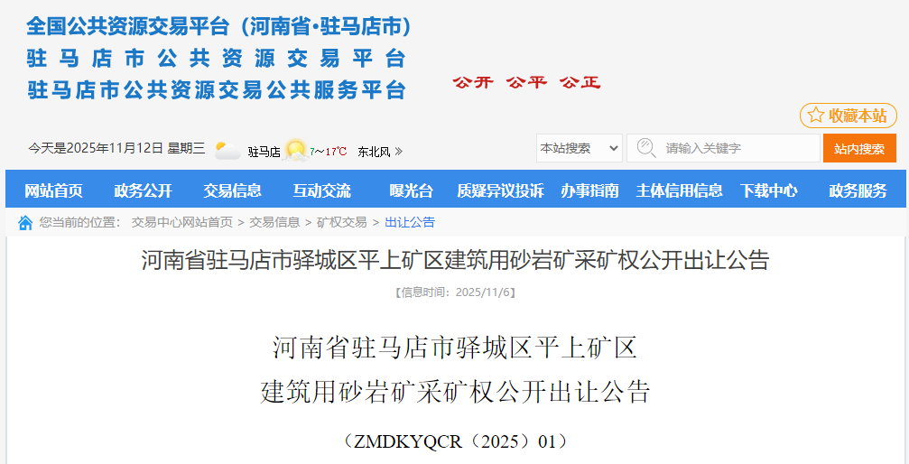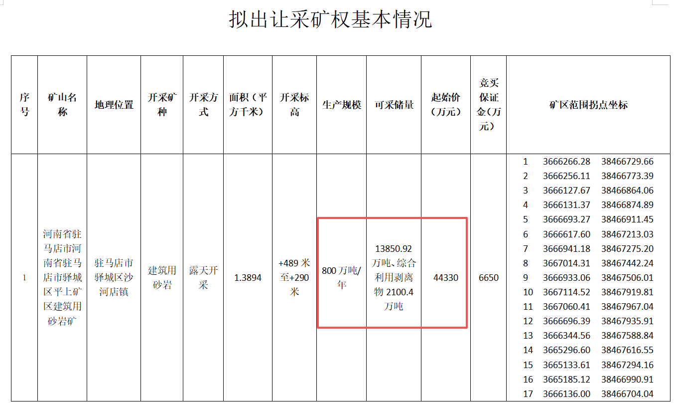 近日,河南省駐馬店市公共資源交易平臺(tái)發(fā)布驛城區(qū)平上礦區(qū)建筑用砂巖礦采礦權(quán)公開(kāi)出讓公告。該礦資源儲(chǔ)量近1.6億噸(建筑用砂巖可采儲(chǔ)量13850.92萬(wàn)噸、綜合利用剝離物2100.4萬(wàn)噸),生產(chǎn)規(guī)模800萬(wàn)噸/年,首期出讓19.7年,起始價(jià)超4.43億元。
