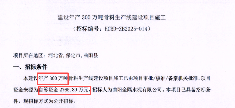 據(jù)悉,河北省曲陽金隅水泥有限公司發(fā)布建設(shè)年產(chǎn)300萬噸骨料生產(chǎn)線建設(shè)項(xiàng)目招標(biāo)公告,項(xiàng)目資金來源為自籌資金2765.89萬元。據(jù)悉, 本項(xiàng)目在曲陽金隅水泥有限公司院內(nèi)進(jìn)行建設(shè),建設(shè)生產(chǎn)車間1720.48㎡,儲存車間1210.67㎡,購置鄂式破碎機(jī)、棒條振動(dòng)給料機(jī)、反擊破碎機(jī)、除塵系統(tǒng)、分機(jī)等相關(guān)生產(chǎn)設(shè)備,并進(jìn)行配套設(shè)施建設(shè)。