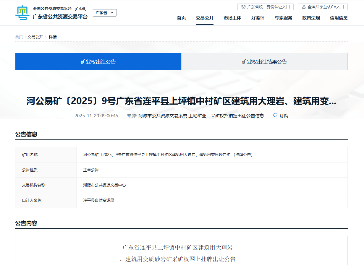 近日,河源市公共資源交易中心以網上掛牌形式出讓廣東省連平縣上坪鎮(zhèn)中村礦區(qū)建筑用大理巖、建筑用變質砂巖礦。設計建筑用大理巖可采資源量礦石量1198.03萬立方米,建筑用變質砂巖可采資源量礦石量94.66萬立方米,設計開采規(guī)模為80萬立方米/年,出讓年限為18年,掛牌起始價為5382.07萬元。