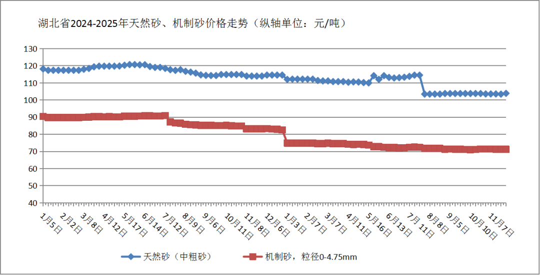監(jiān)測數(shù)據(jù)顯示:11月份,天然砂(中粗砂)、機(jī)制砂全省均價(jià)分別為103.59元/噸、71.27元/噸,環(huán)比分別下降0.07%、上漲0.06%;同比分別下降9.27%、14.74%。具體價(jià)格走勢情況如下圖: