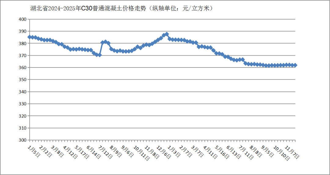 監(jiān)測數(shù)據(jù)顯示:11月份,強(qiáng)度等級C30普通混凝土全省均價(jià)為362.02元/立方米,環(huán)比上漲0.05%,同比下降4.53%。具體價(jià)格走勢情況如下圖: