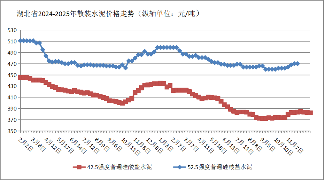 監(jiān)測數(shù)據(jù)顯示:11月份,42.5強(qiáng)度普通硅酸鹽水泥、42.5強(qiáng)度礦渣硅酸鹽水泥、52.5強(qiáng)度普通硅酸鹽水泥全省平均價(jià)格分別為383.21元/噸、375.48元/噸、468.00元/噸,環(huán)比分別上漲0.26%、0.26%、1.41%;同比分別下降11.41%、7.49%、3.24%。具體價(jià)格走勢情況如下圖:
