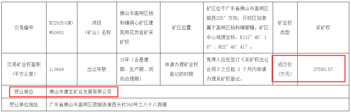近日,廣東佛山市高明區(qū)政府網(wǎng)發(fā)布佛山市高明區(qū)楊和鎮(zhèn)洞心礦區(qū)建筑用花崗巖礦采礦權(quán)出讓結(jié)果公示。佛山市建生礦業(yè)發(fā)展有限公司以27580.57萬元成功競得該項目。