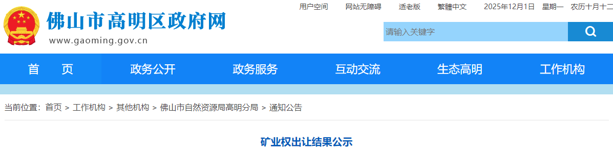 按照《礦業(yè)權(quán)出讓交易規(guī)則》等有關(guān)法律法規(guī),遵循公開、公正、公平的原則。佛山市自然資源局局于2025年11月28日網(wǎng)上掛牌成功出讓1宗采礦權(quán)。現(xiàn)將有關(guān)情況公示如下: