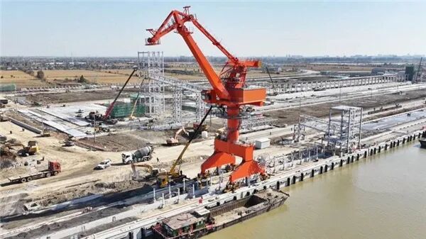在寶應(yīng)港城北作業(yè)區(qū)建設(shè)現(xiàn)場(chǎng),兩臺(tái)橘色門機(jī)矗立運(yùn)河岸邊,成為現(xiàn)場(chǎng)標(biāo)志性景觀。工作人員正全力開展設(shè)備安裝調(diào)試工作,這批新門機(jī)相較于運(yùn)河沿線碼頭傳統(tǒng)吊裝設(shè)備,堪稱“量身定制”的高效作業(yè)利器。設(shè)計(jì)團(tuán)隊(duì)綜合考量碼頭承重載荷、門機(jī)變幅長(zhǎng)度等關(guān)鍵參數(shù),為其配備抓斗、吊鉤、集裝箱等多種吊具,不僅操作靈活可靠、故障率低,更實(shí)現(xiàn)了作業(yè)效能的大幅提升。“根據(jù)設(shè)計(jì)要求,我們定制了4臺(tái)門機(jī),其中最大起重量達(dá)40噸。別看它塊頭大,操作起來卻十分靈敏,可實(shí)現(xiàn)360度旋轉(zhuǎn),后期裝卸效率將顯著提高。”現(xiàn)場(chǎng)安裝工作人員陳佳鑫介紹道。