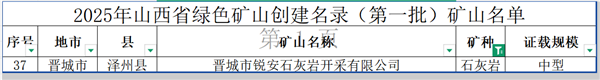 日前,2025年山西省綠色礦山創(chuàng)建名錄(第一批)礦山名單公布,晉城市銳安石灰?guī)r開采有限公司憑借在綠色生產(chǎn)、生態(tài)保護等方面的突出表現(xiàn)順利入選,成為此次名錄中唯一入選的石灰?guī)r礦企業(yè)。
