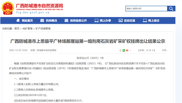近日,廣西防城港市自然資源局發(fā)布防城港市上思縣平廣林場(chǎng)那厘站第一熔劑用石灰?guī)r礦采礦權(quán)掛牌出讓結(jié)果。該項(xiàng)目資源儲(chǔ)量超2億噸,生產(chǎn)規(guī)模850萬(wàn)噸/年,出讓年限24年。上思縣萬(wàn)鑫石灰有限公司掛牌底價(jià)5.77億元競(jìng)得,折合資源價(jià)款2.82元/噸。