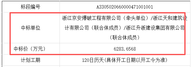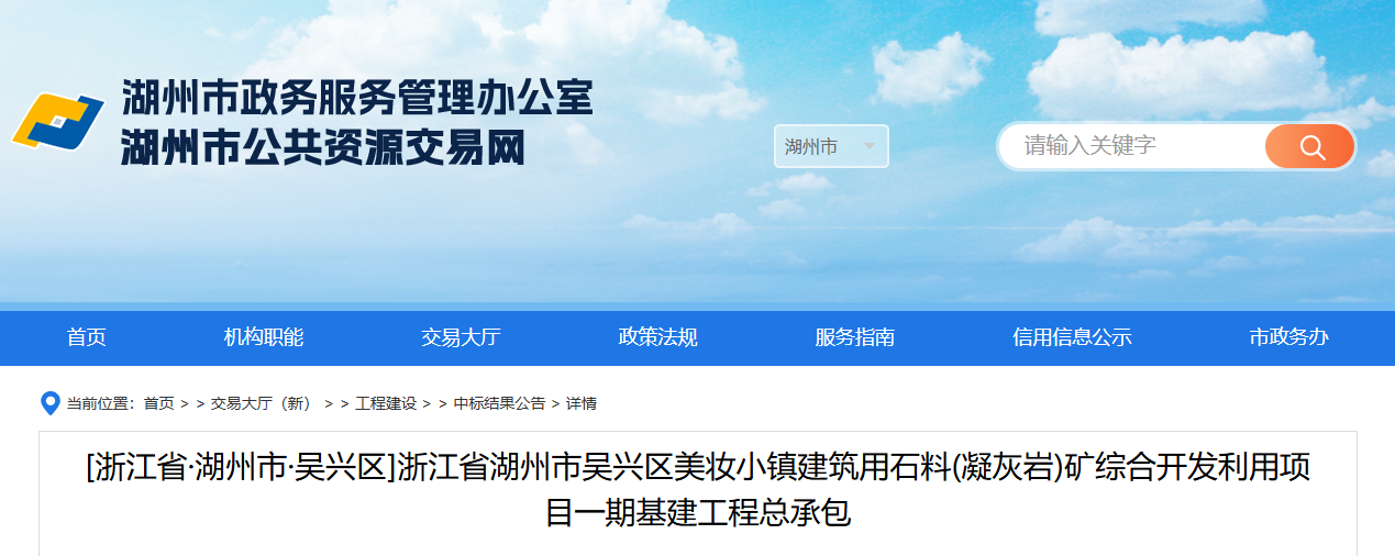近日,浙江省公共資源交易服務(wù)平臺發(fā)布浙江湖州吳興區(qū)美妝小鎮(zhèn)建筑用石料(凝灰?guī)r)礦綜合開發(fā)利用項目一期基建工程總承包中標(biāo)結(jié)果公告,浙江京安爆破工程有限公司(牽頭單位)、浙江天和建筑設(shè)計有限公司、浙江升浙建設(shè)集團(tuán)有限公司(聯(lián)合體成員)以投標(biāo)報價6283.6568萬元中標(biāo)。