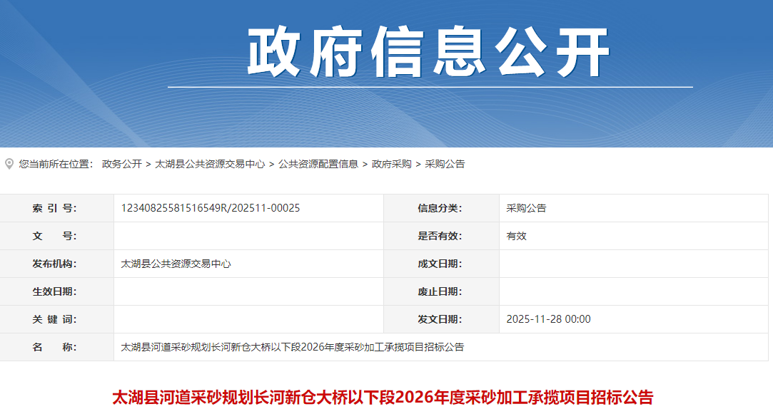近日,安徽安慶太湖縣人民政府網(wǎng)站發(fā)布太湖縣河道采砂規(guī)劃長河新倉大橋以下段2026年度采砂加工承攬項目招標(biāo)公告。