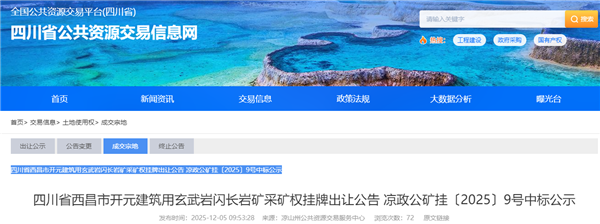 12月5日,四川省涼山州西昌市開元建筑用玄武巖閃長巖礦采礦權(quán)被當?shù)貒?mdash;—西昌順合鑫礦業(yè)有限公司成功競得。該礦總資源量超1億噸,生產(chǎn)規(guī)模不低于300萬噸/年,擬出讓年限30年,成交價3.1億元,單價約3.06元/噸。