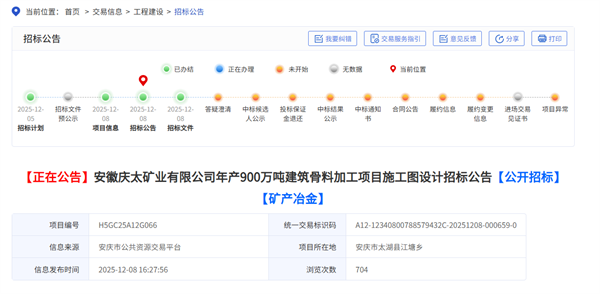 近日,安徽安慶太湖縣公共資源交易中心發(fā)布安徽慶太礦業(yè)有限公司900萬噸/年建筑骨料加工項目施工圖設計招標公告。