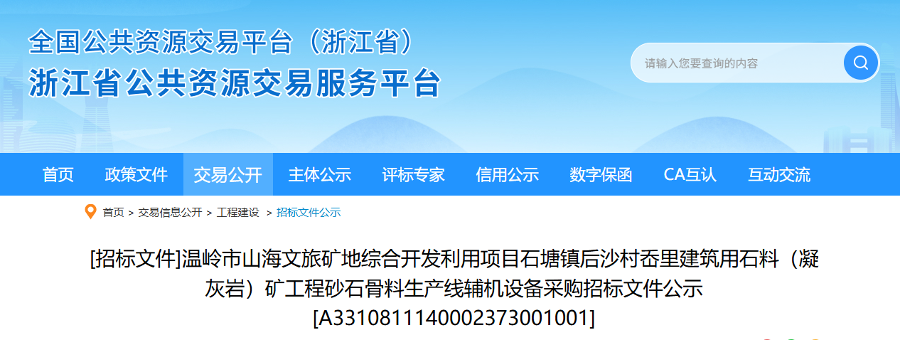 近日,浙江溫嶺市山海文旅礦地綜合開發(fā)利用項目石塘鎮(zhèn)后沙村岙里建筑用石料(凝灰?guī)r)礦工程己由溫嶺市發(fā)展和改革局批準建設,項目己具備招標條件,現對該項目的砂石骨料生產線輔機設備采購進行公開招標。項目招標人為溫嶺市金達建設有限公司、浙江省隧道工程集團有限公司。
