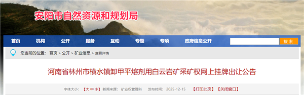 12月15日,河南省安陽市自然資源和規(guī)劃局發(fā)布林州市橫水鎮(zhèn)卸甲平熔劑用白云巖礦采礦權(quán)掛牌出讓公告。該礦可利用資源量5740.24萬噸,出讓年限19年,開采規(guī)模300萬噸/年,起始價(jià)1.53億元,折合資源價(jià)款超2.66元/噸。掛牌時(shí)間為2026年1月13日-2026年1月27日。