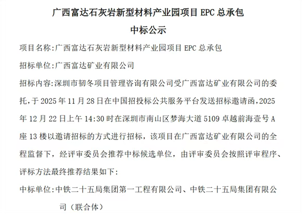 近日,中國(guó)招標(biāo)投標(biāo)公共服務(wù)平臺(tái)公示廣西富達(dá)石灰?guī)r新型材料產(chǎn)業(yè)園項(xiàng)目EPC總承包中標(biāo)結(jié)果。據(jù)悉,該項(xiàng)目以邀請(qǐng)招標(biāo)的方式進(jìn)行,最終在廣西富達(dá)礦業(yè)有限公司的監(jiān)督下,推薦中鐵二十五局集團(tuán)第一工程有限公司、中鐵二十五局集團(tuán)有限公司(聯(lián)合體)中標(biāo),中標(biāo)下浮率為6.3%。