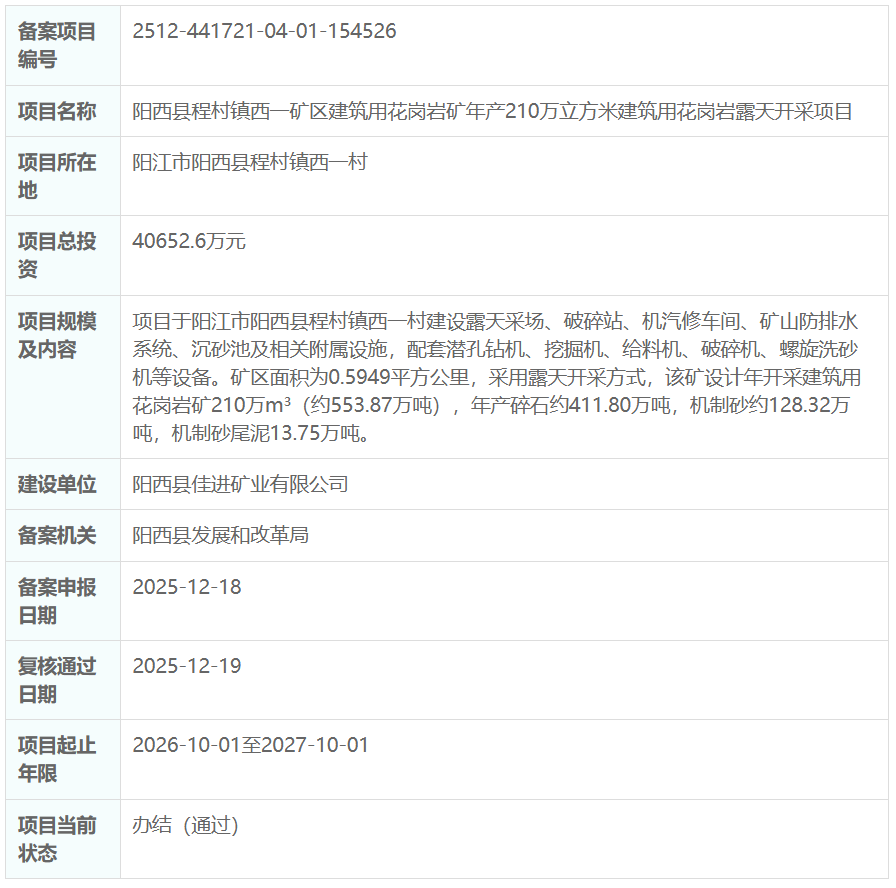 項目位于陽西縣程村鎮西一村,建設露天采場、破碎站、機汽修車間、礦山防排水系統、沉砂池及相關附屬設施,配套潛孔鉆機、挖掘機、給料機、破碎機、螺旋洗砂機等設備。礦區面積為0.5949平方公里,采用露天開采方式,該礦設計年開采建筑用花崗巖礦210萬方(約553.87萬噸)。其中,年產碎石約411.80萬噸,機制砂約128.32萬噸,機制砂尾泥13.75萬噸。具體備案內容如下: