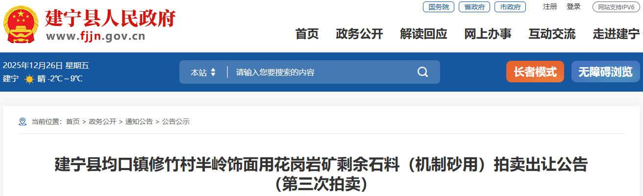 近日福建省建寧縣人民政府發(fā)布建寧縣均口鎮(zhèn)修竹村半嶺飾面用花崗巖礦剩余石料(機(jī)制砂用)拍賣出讓公告(第三次拍賣)。