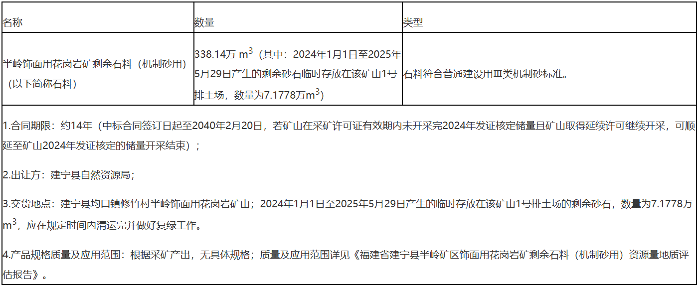 根據(jù)拍賣出讓公告內(nèi)容:此次出讓的半嶺飾面用花崗巖礦剩余石料(機(jī)制砂用)數(shù)量為338.14萬m³(其中:2024年1月1日至2025年5月29日產(chǎn)生的剩余砂石臨時存放在該礦山1號排土場,數(shù)量為7.1778萬m³),拍賣起始價1550萬元,合同期限約14年。